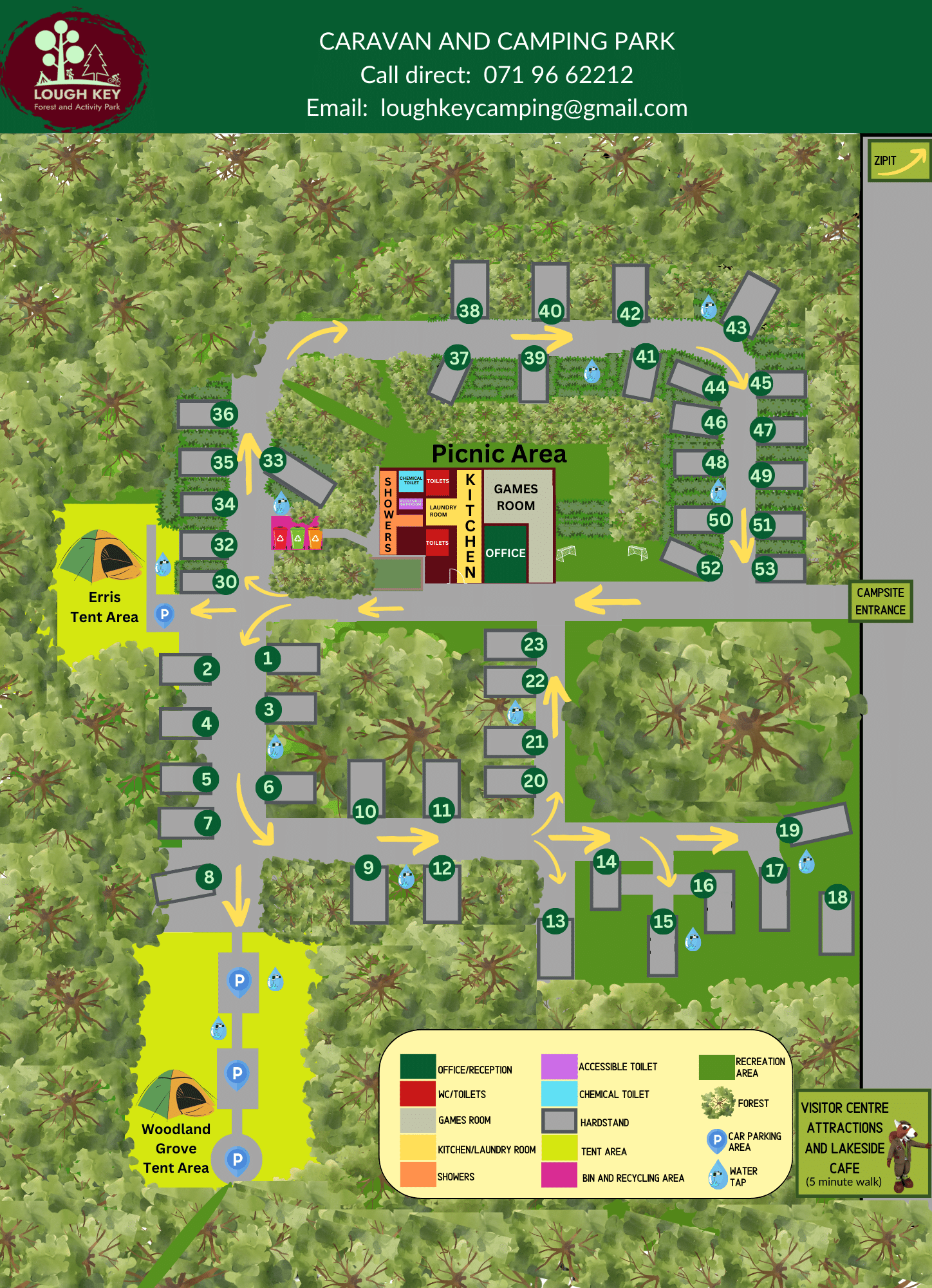 Facilities on site include showers, toilets, laundry room, along with cooking hobs and washing area. The recreational room contains a football & pool table, TV and Arcade machines.